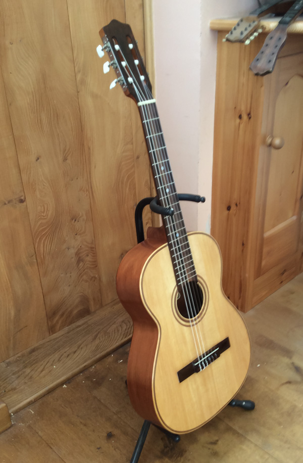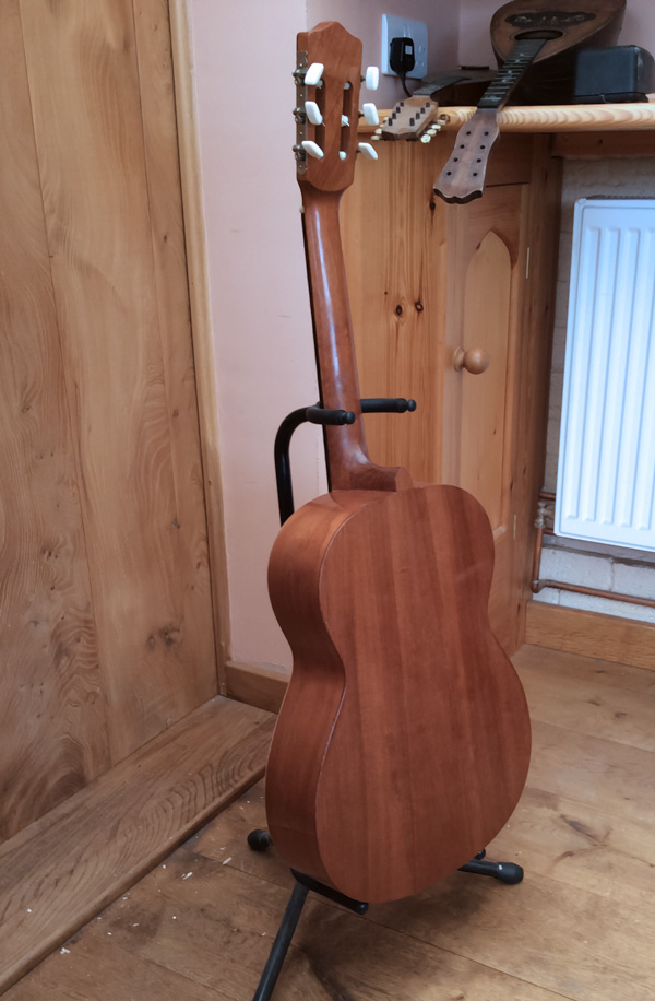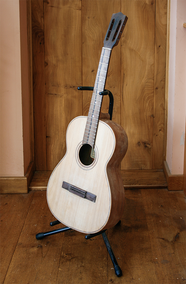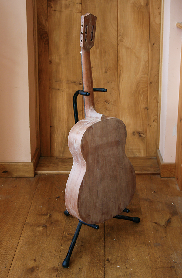 I have repaired a split in the side of the guitar. The side walls are so thin that the only option was to patch the inside. I preformed a Rosewood veneer which was then adhered to the inside of the guitar using animal glue which dries hard and will mineralise becoming a good transporter of sound.