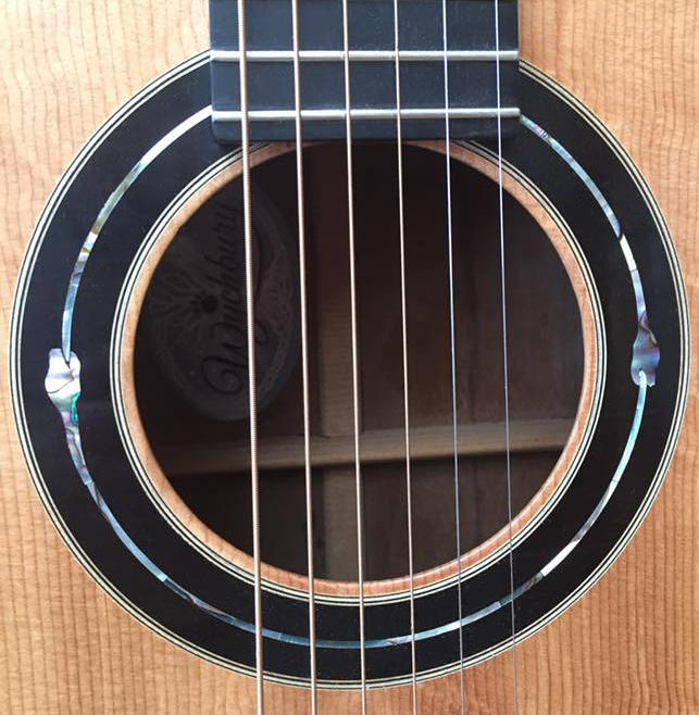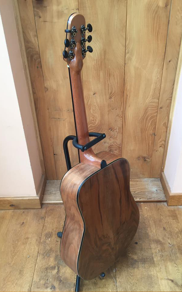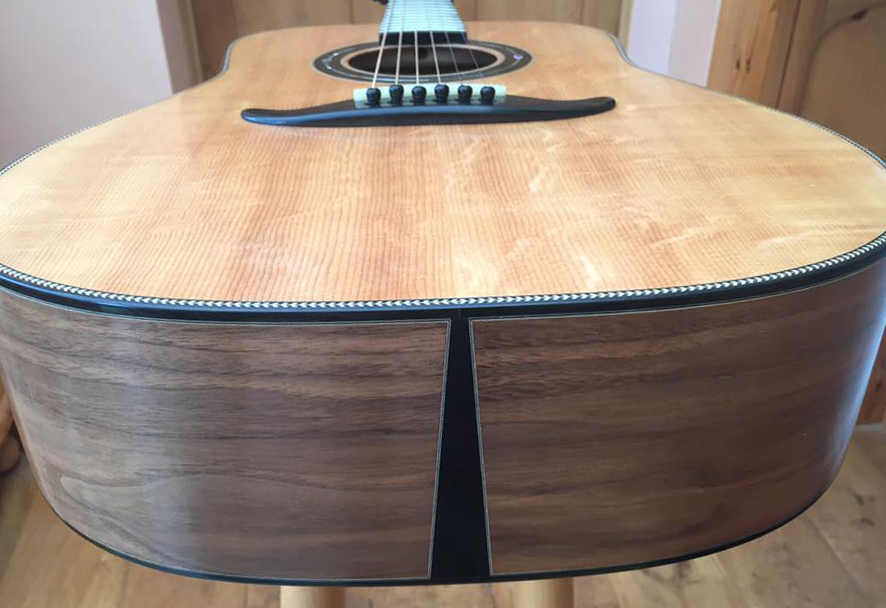 A traditionally shaped dreadnought using a master quality Bear Claw Sitka Spruce soundboard. Figured Walnut back and sides with a 1 piece dovetailed Spanish Cedar, D shaped, neck with a nut width of 43mm and ebony fingerboard. A scale length of 664mm (25.34”) and 21 frets. The head of the neck is designed to be stronger than a standard neck and to transmit more of the energy of the strings to the bridge. The Ebony bridge is a modern shape echoeing a traditional style. Solid Ebony rosette and Abalone serpent inlay. Ebony bindings and Herringbone purfling. Only unbleached Bone nuts are used for superior sound quality. The fingerboard radius is 16” and has Mother of Pearl inlay. The soundboard has tuned quarter sawn sitka spruce x-brace struts in sympathy with A at 440Hz. Swiss made Schertler machine heads. Spanish cedar kerfing. Bowed back and front with a 40ft front radius and a 15ft back radius.